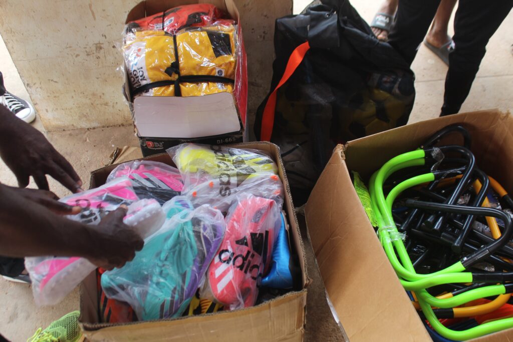 The items include footballs, jerseys, boots, shin guards, gloves, hurdles, and training cones—resources that will enable the club to train and develop its young athletes.